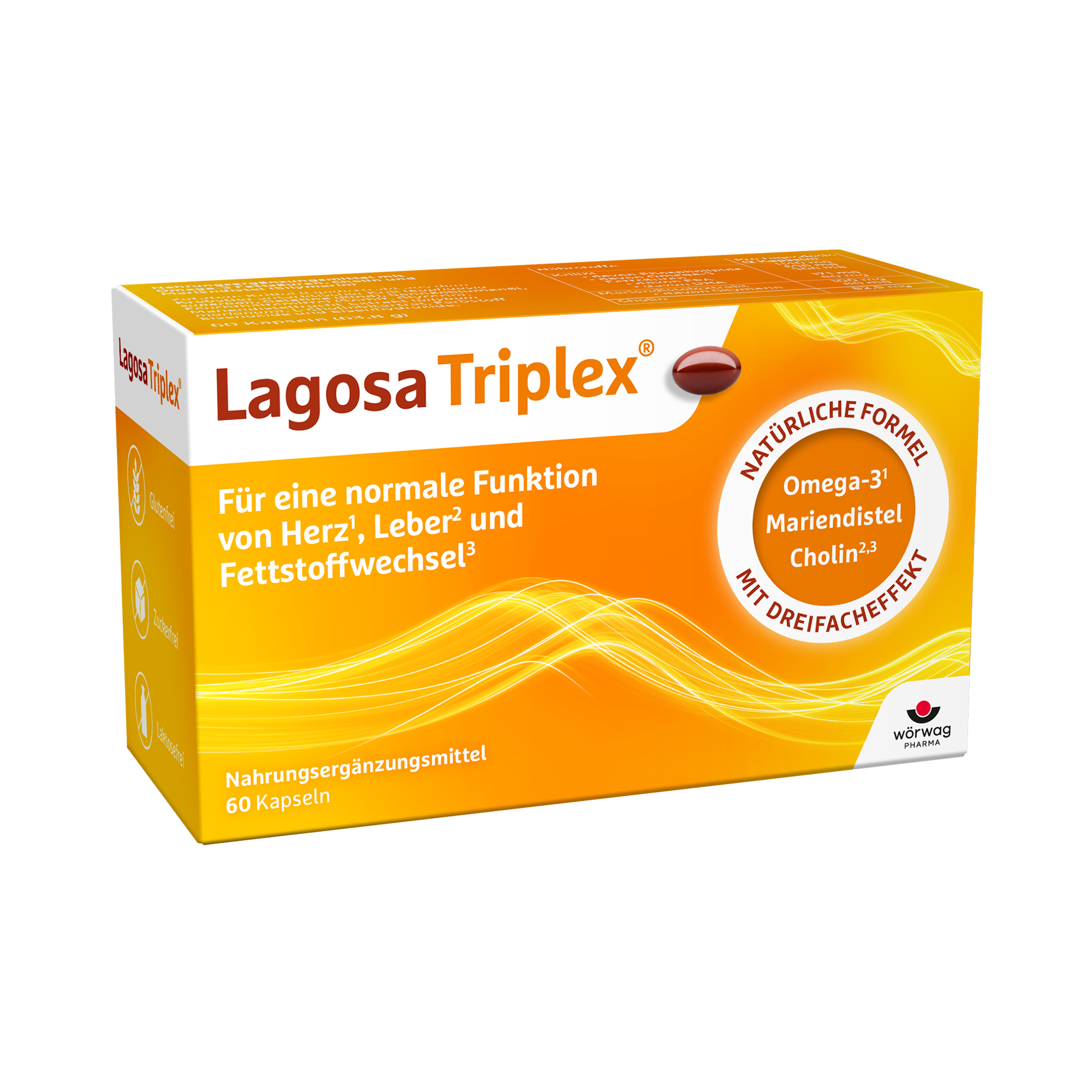 Lagosa Triplex® Nahrungsergänzungsmittel. 1 Die Omega-3 Fettsäuren EPA und DHA tragen zu einer normalen Herzfunktion bei. Die positive Wirkung stellt sich bei einer täglichen Aufnahme von 250 mg EPA und DHA ein. 2 Cholin trägt zur Erhaltung einer normalen Leberfunktion bei. 3 Cholin trägt zu einem normalen Fettstoffwechsel bei. Die angegebene empfohlene Verzehrmenge darf nicht überschritten werden. Nahrungsergänzungsmittel sollen nicht als Ersatz für eine ausgewogene, abwechslungsreiche Ernährung und eine gesunde Lebensweise verwendet werden. Das Produkt ist außerhalb der Reichweite von kleinen Kindern aufzubewahren. Wörwag Pharma GmbH & Co. KG, 71034 Böblingen