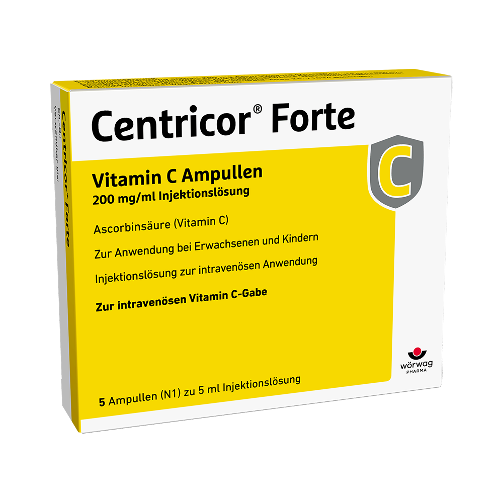 Centricor® Forte Vitamin C Ampullen 200 mg/ml Injektionslösung. Wirkstoff: Ascorbinsäure 1000mg (Vitamin C). 1 ml Injektionslösung enthält 200 mg Ascorbinsäure. 1 Ampulle zu 5 ml enthält 1000 mg Ascorbinsäure. Anwendungsgebiete: Vorbeugung und Behandlung von klinischen Vitamin C-Mangelzuständen, die ernährungsmäßig nicht behoben oder oral substituiert werden können; Methämoglobinämie im Kindesalter. Zu Risiken und Nebenwirkungen lesen Sie die Packungsbeilage und fragen Sie Ihre Ärztin, Ihren Arzt oder in Ihrer Apotheke. Wörwag Pharma GmbH & Co. KG, 71034 Böblingen